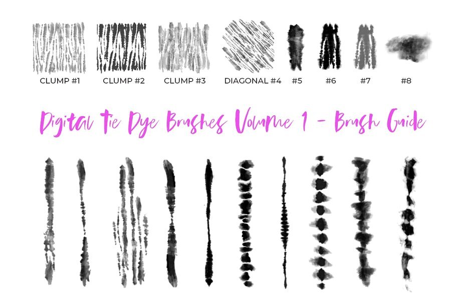 • 18 tie-dye stripes, clumps, and a variety of stamp brush shapes!